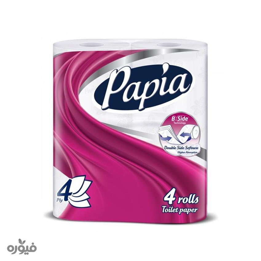 دستمال توالت پاپیا محصولی با کیفیت است که با تعداد رول های مختلف در بسته بندی متفاوت قرار دارد. پک 4 رول این دستمال توالت از هر رول 4 لایه با ابعاد 12.3 در 10 سانتی متر تولید شده که این اندازه به عنوان سایز کوچک در دستمال توالت شمرده می شود اما با وجود 4 لایه موجود در هر برگ قدرت جذب آب بالاست و  استفاده از این محصول را آسان می نماید.