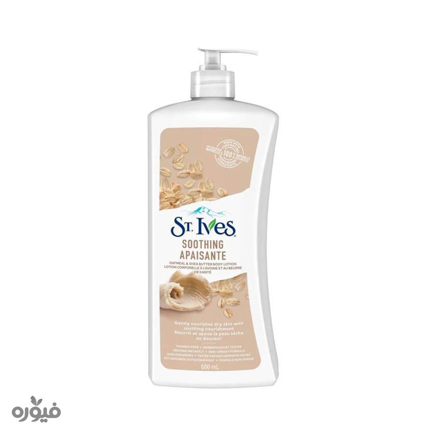 لوسیون بدن تسکین دهنده عصاره جو دوسر و شی باتر سینت ایوز St.ives  یک نرم کننده و مرطوب کننده قوی است که در رفع خشکی پوست تاثیر بسیار زیادی دارد همچنین سوزش و خارش پوست را نیز از بین می‌برد و موجب التیام حساسیت‌های پوستی می‌شود. استفاده از این لوسیون برای پوست‌های خشک بسیار مناسب است. لوسیون بدن سینت ایوز سرعت جذب بالایی دارد و اثر چربی روی پوست باقی نمی‌گذارد.این لوسیون یک نرم کننده و مرطوب کننده قوی است و با رفع خشکی پوست، سوزش و خارش آن را هم از بین می‌برد. برای کمک به درمان خشکی‌های مزمن می‌تواند بسیار موثر باشد و التیام بخش خوبی است.برای افرادی که لایه برداری خفیف انجام داده‌اند، ترمیم کننده‌ی مفیدی خواهد بود.